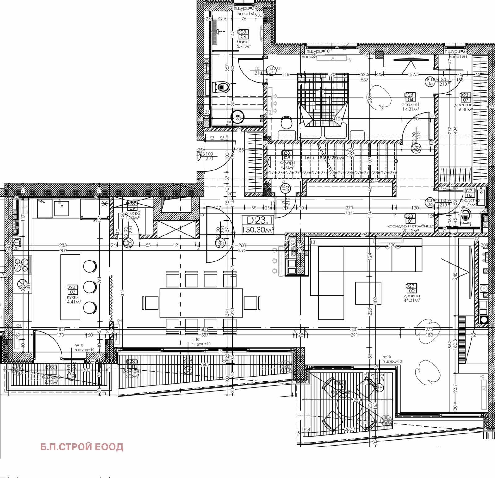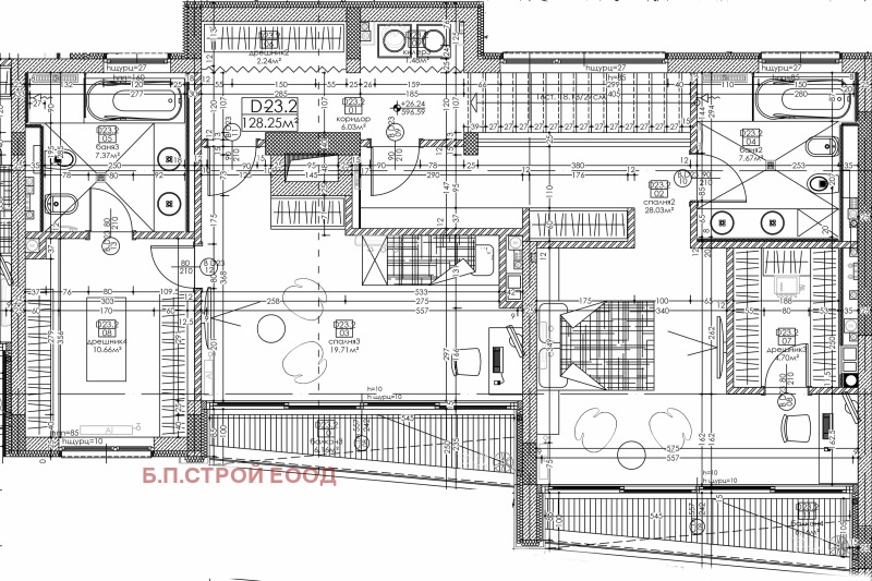 Жилището е разположено във вход D на сградата, изложението е югоизток/ северозапад, етаж 8 и 9. Апартамент D-23 е със застроена площ от 278.55 кв.м. и има следното разпределение: