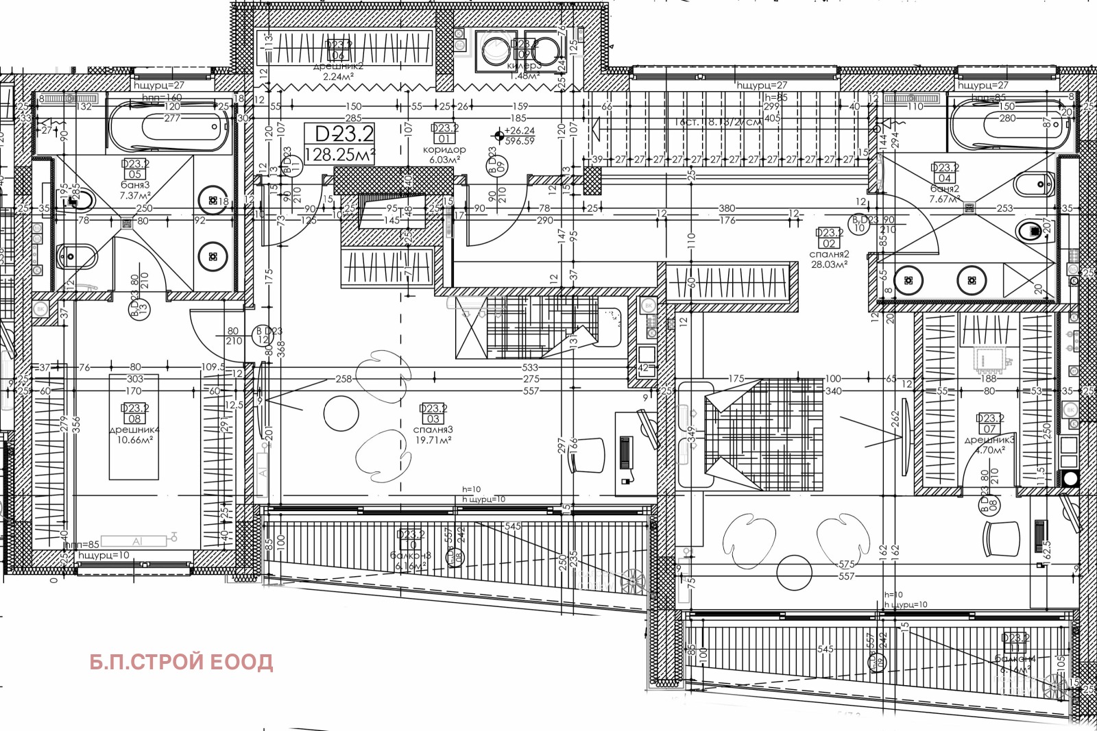 Ниво 2: спалня с дрешник и баня с тоалетна, втора спалня с дрешнк, баня с тоалетна, мокро помещение и два балкона.