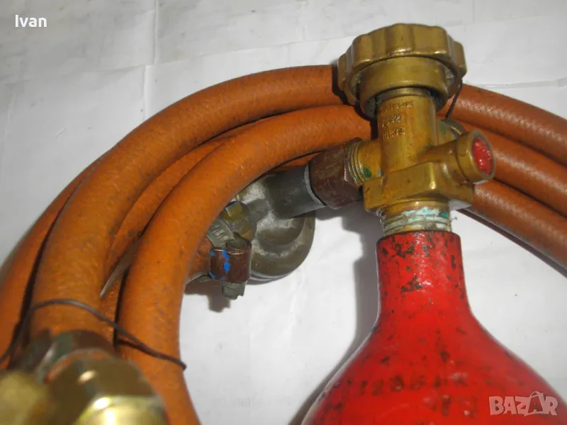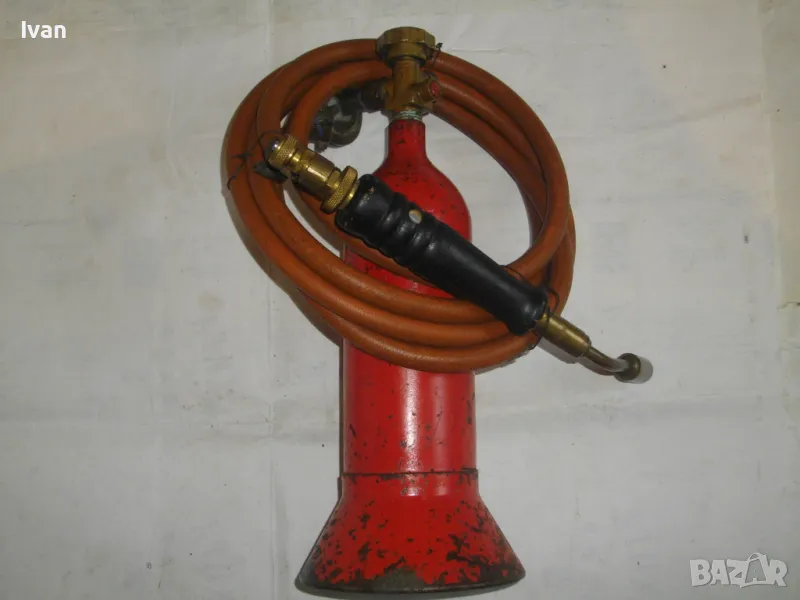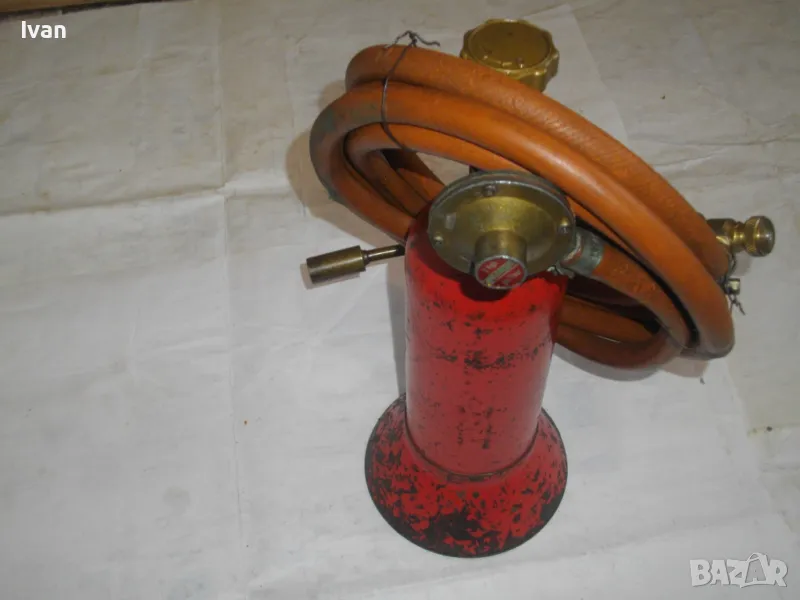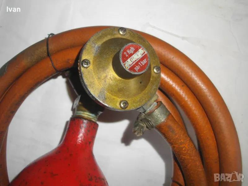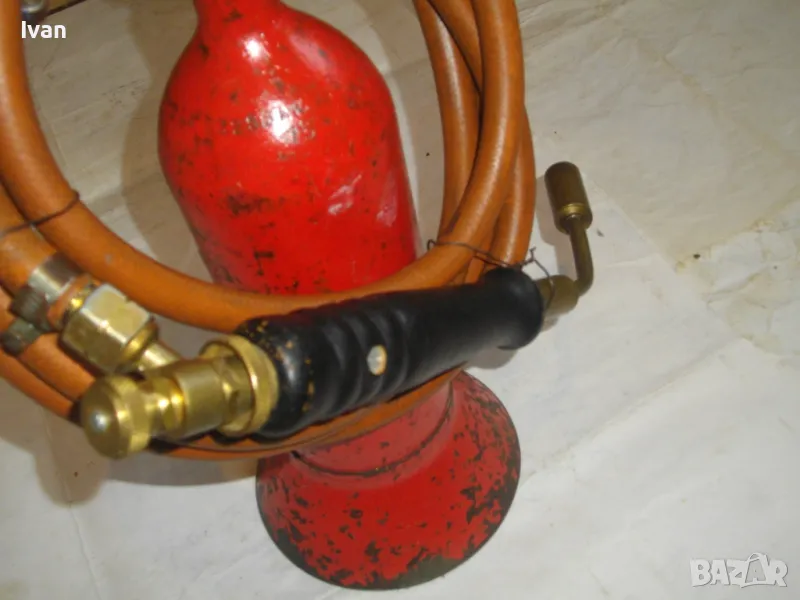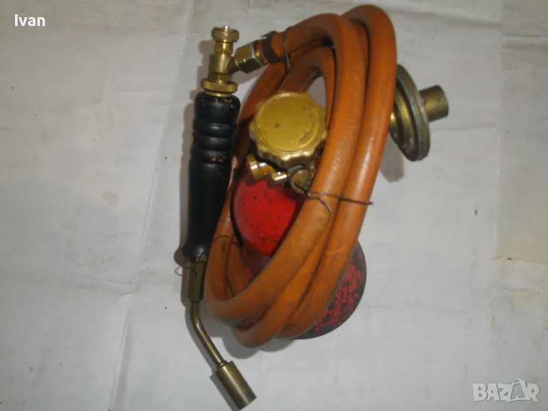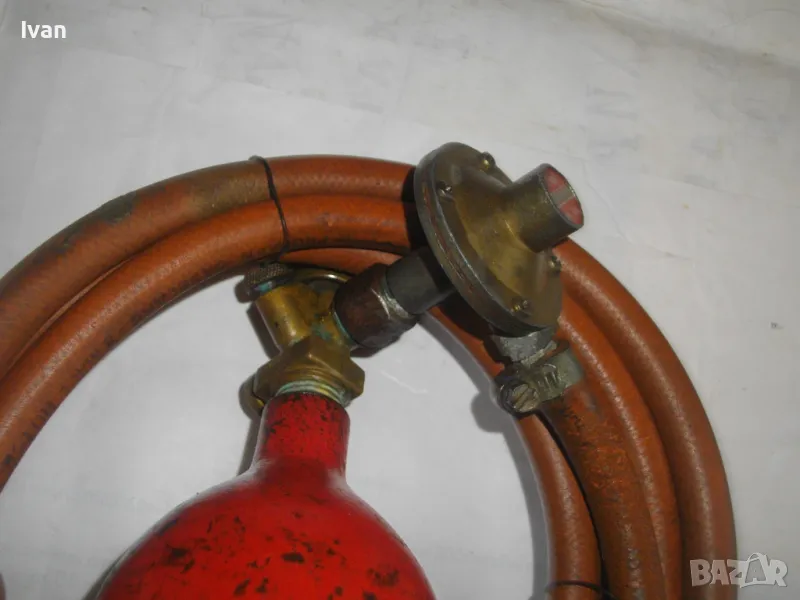 редуцир вентил. Височина на бутилката - 30 см. Бронзов спирателен кран с клапан, скачен редуцир вентил ниско налягане pa-1 bar 2kg/h. Скачен маркуч 2 м, без забележки, ез напуквания. Горелка скачена - немска, стар тип, масивна, почти нова. Дървена дръжка въртелива с оригинална черна боя, която не е охлузена. Бронзова рамо с бронз дюза ф18 мм, бронзова глава с бронзов спирателен кран. Дължина на горелката - 30 см. Комплекта е почти нов. Тегло на всичко - 3,0 кг. Цена 259 лв. В бутилката има малко газ за проба и тест. Бутилката е метална изцяло, масивна, от плътно и дебело желязо.