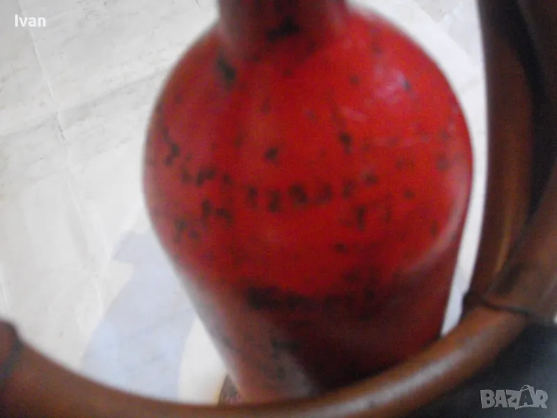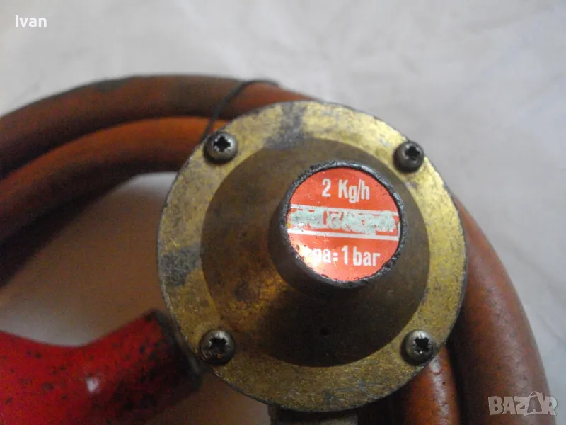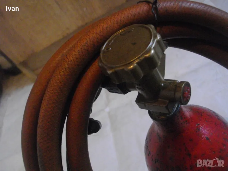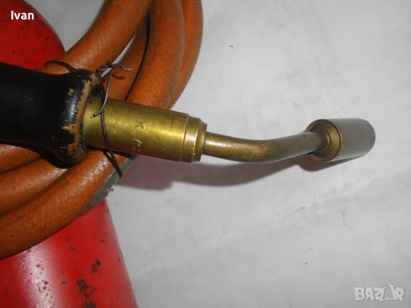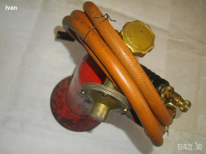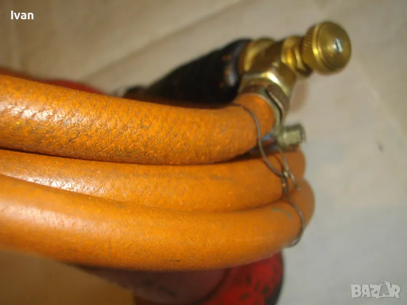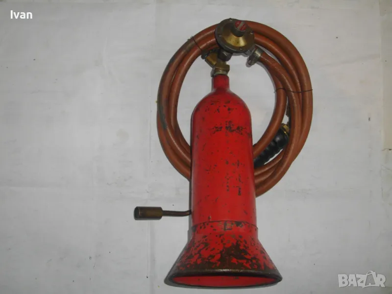 редуцир вентил. Височина на бутилката - 30 см. Бронзов спирателен кран с клапан, скачен редуцир вентил ниско налягане pa-1 bar 2kg/h. Скачен маркуч 2 м, без забележки, ез напуквания. Горелка скачена - немска, стар тип, масивна, почти нова. Дървена дръжка въртелива с оригинална черна боя, която не е охлузена. Бронзова рамо с бронз дюза ф18 мм, бронзова глава с бронзов спирателен кран. Дължина на горелката - 30 см. Комплекта е почти нов. Тегло на всичко - 3,0 кг. Цена 259 лв. В бутилката има малко газ за проба и тест. Бутилката е метална изцяло, масивна, от плътно и дебело желязо.