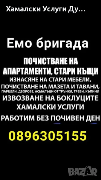 Хамалски услуги - Емо Бригада Предлага:⛏️ КЪРТЕНЕ, 🧹ЧИСТЕНЕ, 🚛 ИЗВОЗВАНЕ🏚 БУТАНЕ НА СТАРИ ПОСТРОЙКИ 🏚⚒️ СТРОИТЕЛНО - РЕМОНТНИ ДЕЙНОСТИ🌱🌿 КОСЕНЕ И РЯЗАНЕ НА ХРАСТИ ❗️БЕЗПЛАТЕН ОГЛЕД В РАМКИТЕ НА 24Ч.💰ЦЕНИ ПО ДОГОВАРЯНЕ❗️РАБОТИМ ПО ВСЯКО ВРЕМЕ НА ГОДИНАТАБЕЗ ЗНАЧЕНИЕ ОТ СЕЗОНА И ДЕНЯ! ☎️ 0896305155 Емо Бригада❗️Не се колебайте да се свържете с нас ❗️Даваме информация и отговаряме на всички ваши въпроси ❗️ ✅️Доверете ни се! ✅️ Залагаме на качество, коректност, достъпни цени! ✅️ Грижим се да пестите време и усилия! ❗️РАБОТИМ В ОБЛАСТИТЕ:🌍 КЮСТЕНДИЛ🌍 БЛАГОЕВГРАД🌍 ПЕРНИК🌍 СОФИЯ ⛏️ КЪРТЕНЕ - бетон, тухли, фаянс, теракот, камък, плочки, бутане на стари постройки🧹 ЧИСТЕНЕ - мазета, апартаменти, тавани, дворове, къщи.🚛 ИЗВОЗВАНЕ - различни видове товари и строителни отпадъци до лицензирано сметище.🌱 КОСЕНЕ И РЯЗАНЕ - тревни площи, тръни, храсти.🛠 СТРОИТЕЛНО - РЕМОНТНИ ДЕЙНОСТИ - пробиване на отвори за врати, пробиване на канали за тръби#КЪРТЕНЕ, #ЧИСТЕНЕ, #КОСЕНЕ, #РЯЗАЗАНЕ, #УСЛУГИ #С #ТРИСТРАНЕН #ИЗВОЗВАННЕ #НА #РАЗЛИЧНИ #ВИДОВЕ #ТОВАРИ, #СТРОИТЕЛНО - #РЕМОНТИ #ДЕЙНОСТИ #БУТАНЕ #НА #СТАРИ #ПОСТРОЙ