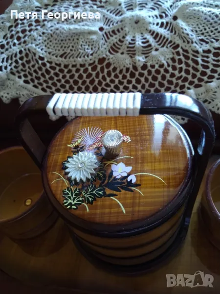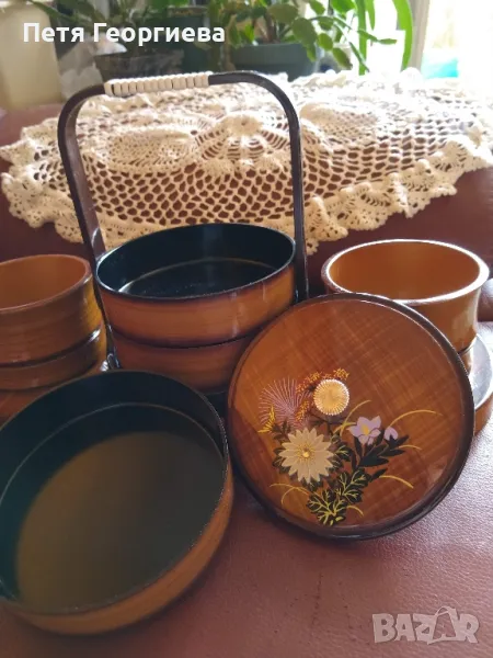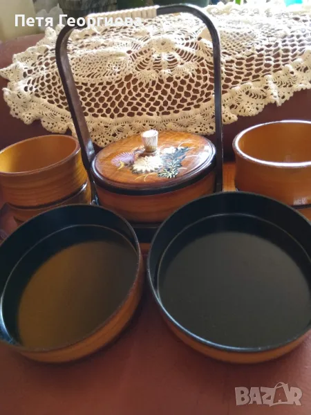 Японски комплект от 5 части за сервиране на ядки, крекери и дребни сладки. Централната част, под дръжката, включва три кръгли съда един над друг, покрити с красиво декориран капак. От двете страни има други два съда. Обща поставка с дължина 37 см, ширина 17,5 см и височина до дръжката 20 см. Оригинален подарък.