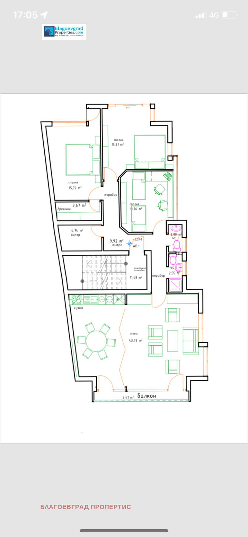 Жилището е разположено на първи етаж, кота + 3.20 м, с площ от 139 кв.м, състоящо се от входно антре, просторна всекидневна зона с кухня, три спални, две бани със санитарен възел, мокро помещение и две тераси. Състоянието, в което се продава жилището е: