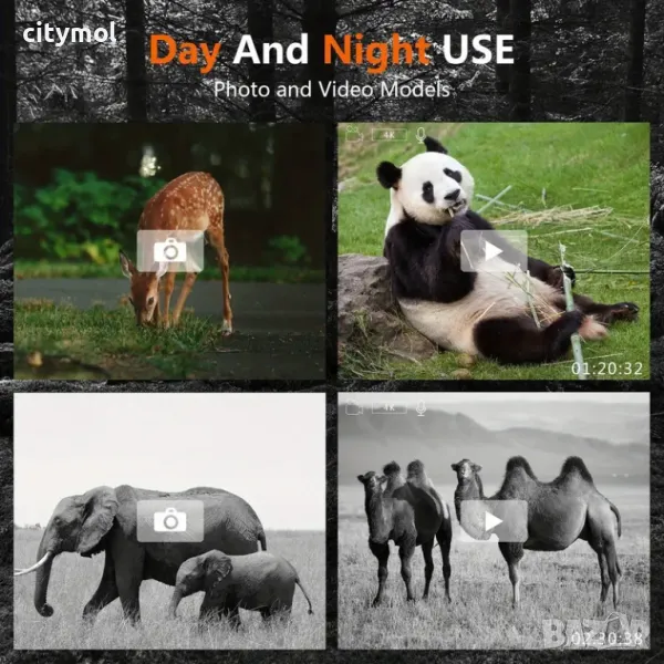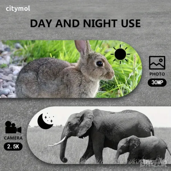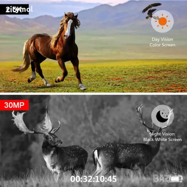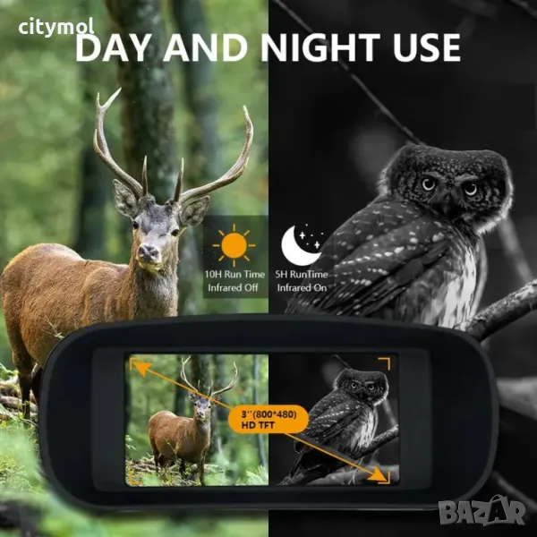 Бинокълът за нощно виждане е снабден с регулируем инфрачервен осветител със 7 нива на 850 nm, а оптичната система ви позволява да виждате ясно животните на тъмно или при слаба околна светлина. Три режима на работа: правене на снимки, запис на видеоклипове и възпроизвеждане, с които можете да правите снимки и видеоклипове с висока разделителна способност и изключителна оптична яснота както през деня, така и при слаба светлина или през нощта.