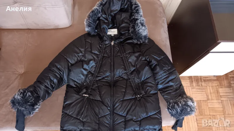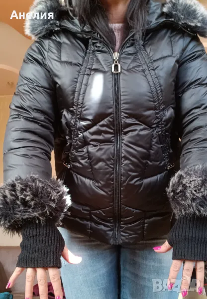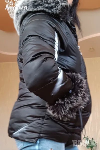 Дамско черно зимно яке със свалящи се пухчета по ръкавите и на качулката! Гръдна обиколка 102-106см. Дължина на ръкава 62см.