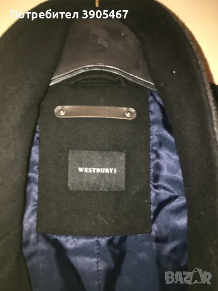 Палтото е черно, от фин вълнен плат. Марка WESTBURY. BELLANDI е производителят на плата.Има два външни, прорязани джоба и два вътрешни. Рамене 54 см, ръкав 68 см и дължина 80 см. Отзад има малък шлиц. Има леки подплънки на раменете. Елегантно и красиво.