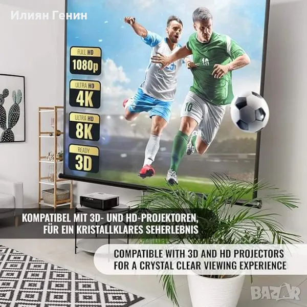 ⭐⭐⭐⭐⭐ ПРАКТИЧЕН: Лесен за боравене - Екранът на проектора може лесно да се разгръща ръчно и да се прибира автоматично. Трислойната структура и черната рамка осигуряват подобрен контраст и най-високо качество.