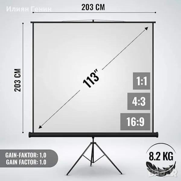Jago® екран проектор - 1:1, 4:3, 16:9, HD 4K 3D, ролетна щора, ръчно разтегателна, усилване 1.0 (203x203 cm - 113") , със статив - 160.00лв.