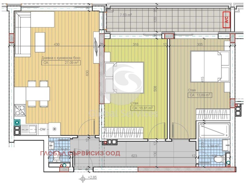 Разпределение: входно антре, дневна с кухненски бокс, две спални, баня с тоалетна, тоалетна, тераса.