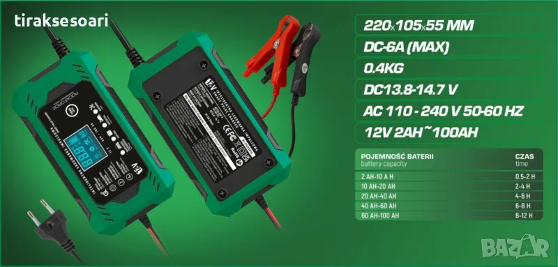 • Поддържани типове батерии: кола, мотоциклет, AGM (със система START-STOP)