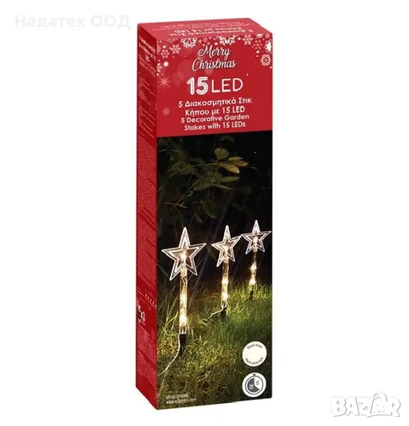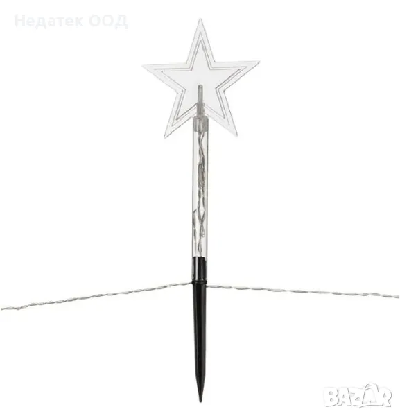 Коледни декоративни батерийни пръчици със звезден дизайн и 3 светодиода на стик. Поставят се на земята като соларни фенери, надземната част е 24см, а разстоянието между клечките е 35см. С функция таймер (6h On/18h Off). Работи с 3 AA батерии (не са включени).