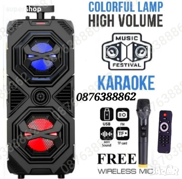НОВО! Караоке Колона Блутут Тонколона 2х8 инча 60см. Безжичен Микрофон