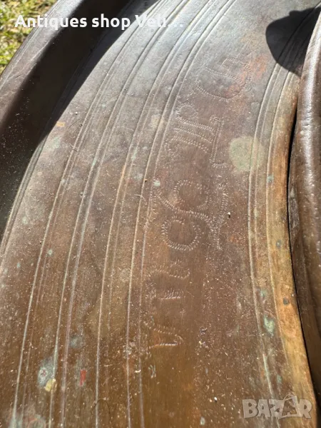 Автентичен меден мангал в много добро състояние. Забелязват се инициали по периферията видни на снимките. Подходящ за колекция или декорация на битов кът. Предлагаме доставка с Еконт и лично предаване за градовете Велико Търново, Русе и Сливен.