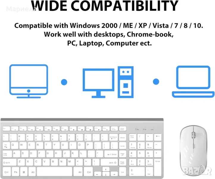 Съвместим с Windows 2000 / ME / XP / Vista / 7 / 8 / 10. Работете добре с Macbook, настолни компютри, Chrome-book, PC, лаптоп, компютър Smart TV и др. И клавиатурата, и мишката дават свят на тишина .