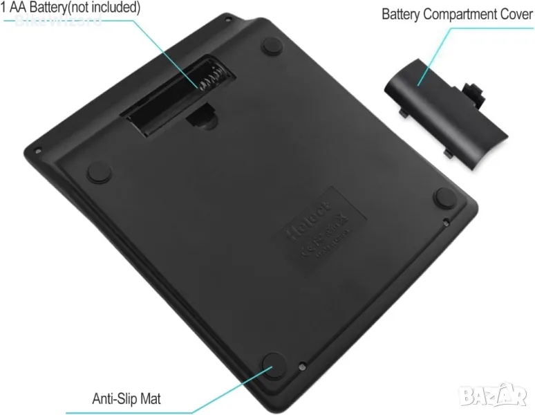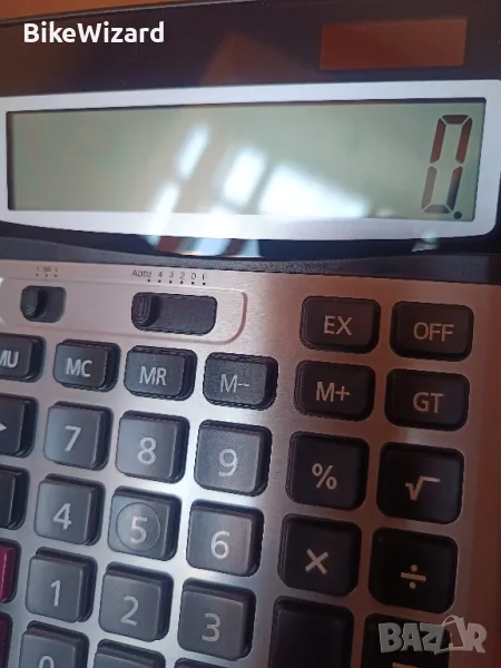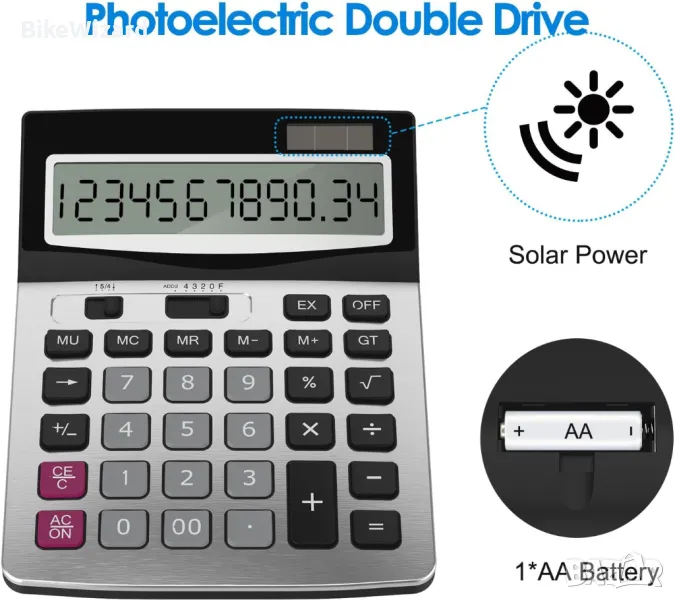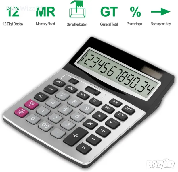 Двупосочно захранване: слънчева енергия и батерия (една AA батерия НЕ е включена) Кръгла функционалност и настройка на десетичната точка Голям 12-разряден дисплей Преобразуване на данъци и валута, функционални и командни знаци Бутони за включване и изключване, марж на печалбата %, +/- , √, превъртане на ключ