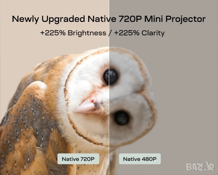 * Резолюция: Поддържа Full HD 1080P (1920x1080), въпреки че собствената му резолюция (native resolution) е HD 720P (1280x720). Това означава, че може да обработва и прожектира съдържание с висока разделителна способност, осигурявайки ясна и детайлна картина.