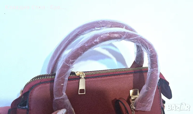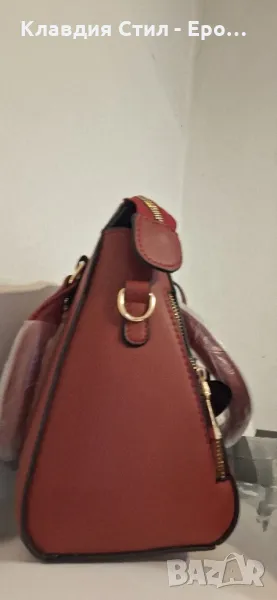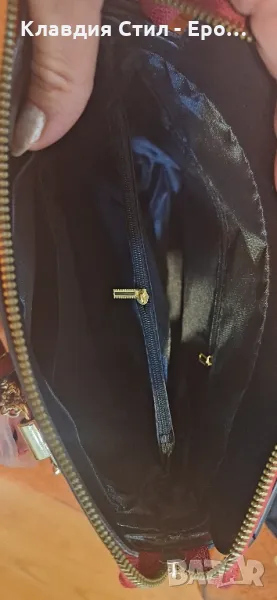 Красива и елегантна дамска чанта, в два цвята - бордо тъмно червен цвят и пастелно розов цвят, отпред е украсена с чаровни бродирани цветя и допълнителна декорация с цвете. Чантата е чисто нова както се вижда с опаковани дръжки, има също дълга дръжка, отвътре има 2 отделения, разделени с преграда-джоб с цип, вътрешен и външен джоб с цип.