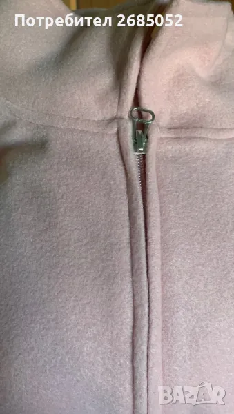 Дамска жилетка с цип от мека полиестерна материя,цвят пепел от рози.Размер на етикета XL. Ширина под мишниците 63 см., от рамо до рамо 51 см., дължина 74 см. Нова,но без етикет.Ако се купи заедно с елека XL,цената за двете ще е 10 евро.