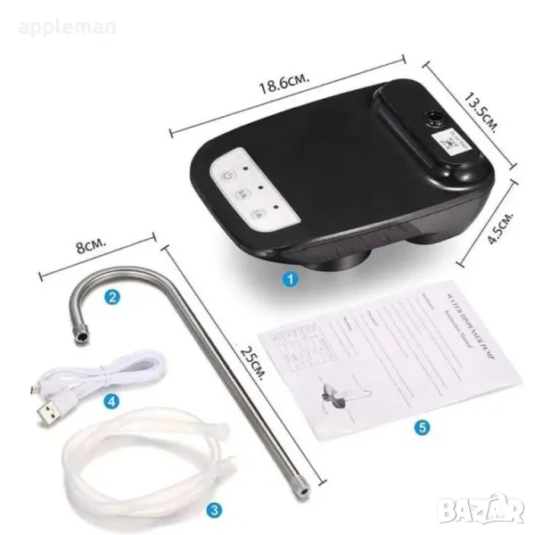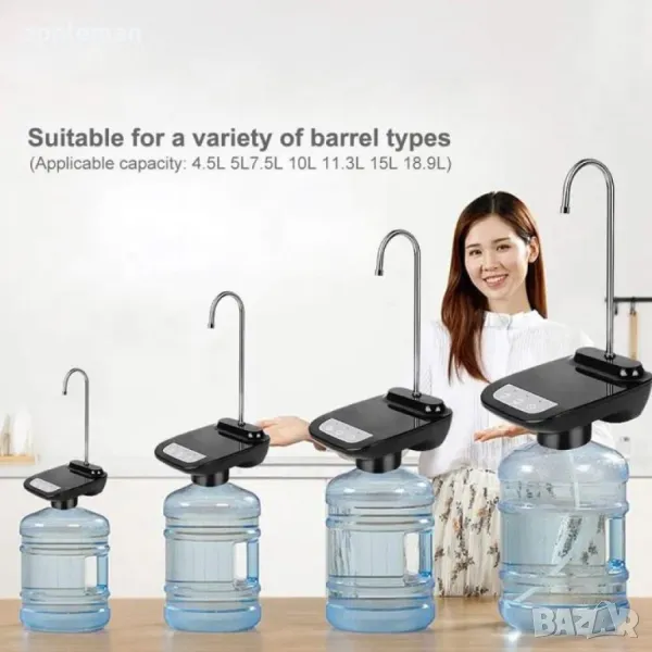 Безжична електрическа помпа подходяща за използване на открито или закрито, за всеки дом или офис. Лесна за пренасяне, с изчистен дизайн. Помпата притежава въртящ се на 360 градуса водопроводен чучур. Притежава 2 режима на интелигентен количествен изход (0.3L и 1.0L) на вода, както и бързо извеждане на водата с един бутон. Подходяща е за бутилки от 4 до 19L.