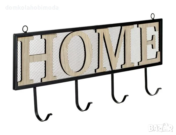 Закачалка с метална основа в черен цвят, с дървени букви в естествен дървесен цвят ,с надпис Home с 4 куки.