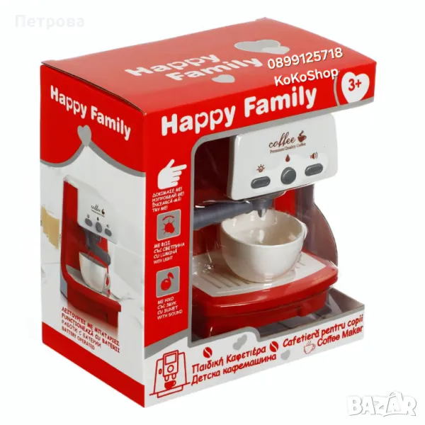 Реалистична детска кафемашина за еспресо. В нея може да се налее вода,която да изтича през цетката в чашката. Кафемашната е със светлини и издава реалистични звуци.