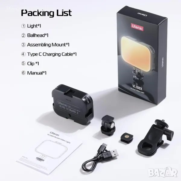Какво получавате: 1 × VL100X LED видео светлина, 1 × щипка, 1 × кабел Typ-C, 1 × сферична глава, 1 × ръководство за потребителя. 𝙇𝙞𝙛𝙚𝙩𝙞𝙢𝙚 𝙒𝙖𝙧𝙧𝙖𝙣𝙩𝙮, ULANZI 100% задоволителен и бърз