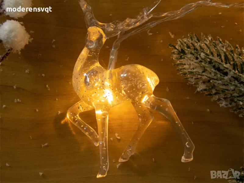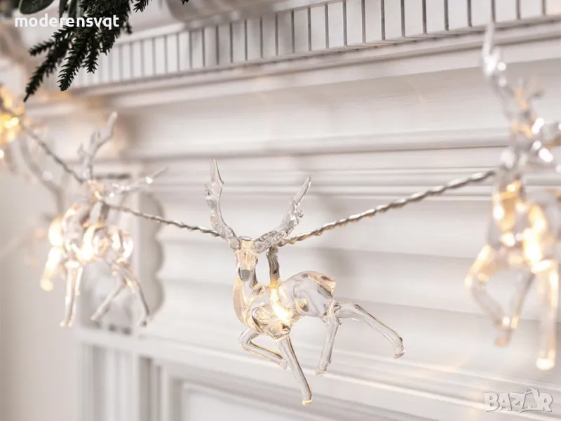 На коледната елха - Използвайте гирлянда като допълнително осветление на елхата. Прозрачният елен с блясък ще отразява красиво светлината от другите декорации, добавяйки елегантен и модерен щрих към вашето коледно дърво.