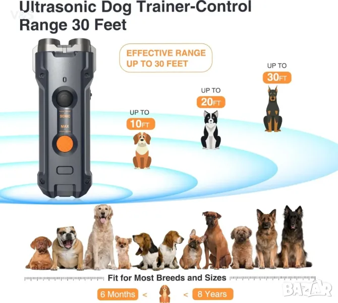 40FT Ефективен контролен обхват: За разлика от други ултразвукови устройства против лай, нашият възпиращ лай разполага с двойни ултразвукови сензори, които осигуряват по-точна насоченост и стабилен ефективен контролен обхват до 40 фута. Независимо дали тренирате на закрито или на открито, той прави тренировката лесна
