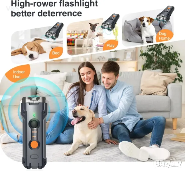 Устройството против лай е проектирано според слуха на кучетата с честота 25KHZ. Само кучетата могат да чуят тази честота и тя няма ефект върху хората. Двете ултразвукови честоти могат да се регулират по желание. Нормалната честота е подходяща за послушни кучета. За кучета с лош нрав можете да използвате силни ултразвукови вълни + LED светкавица, които могат ефективно да привлекат вниманието на кучето и да го успокоят.