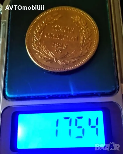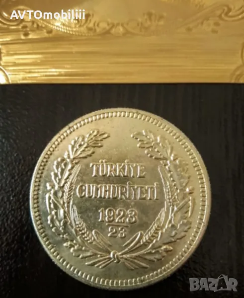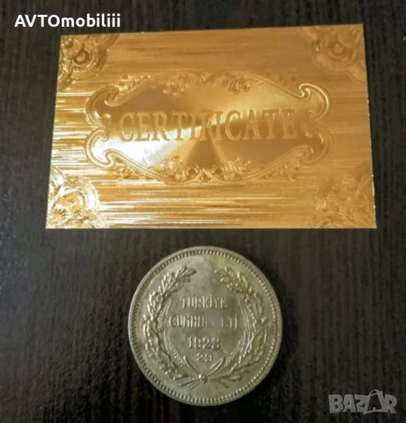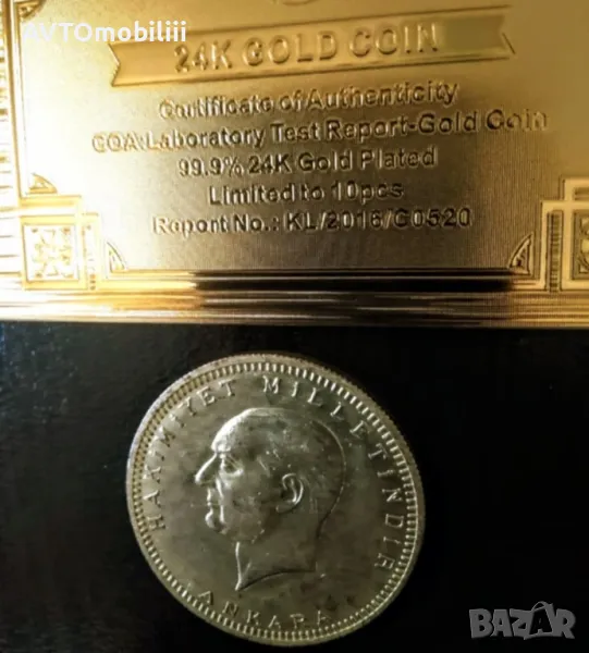 Позлатена турска монета 500 куруша 1945 г. с позлатен 24 каратов сертификат → Обява 48132578