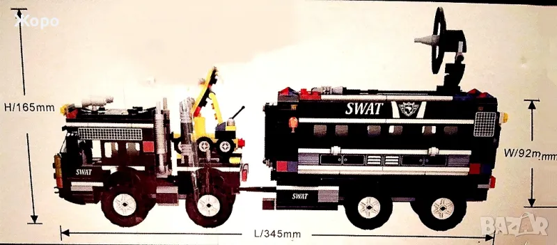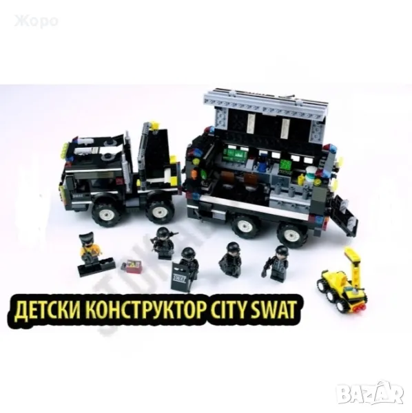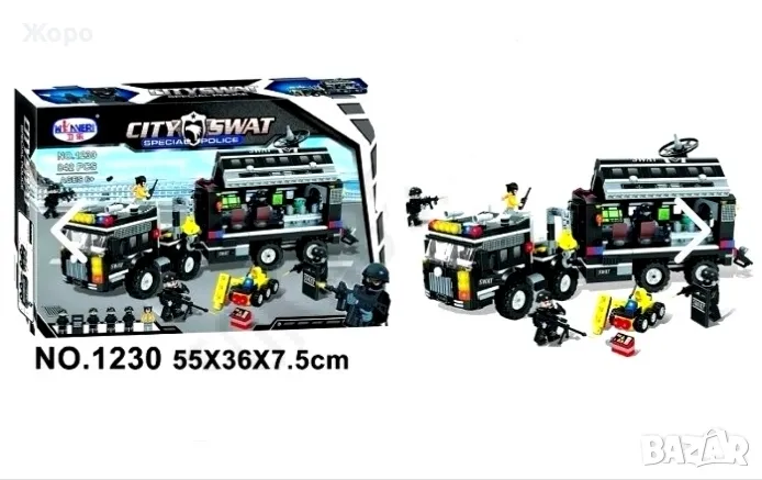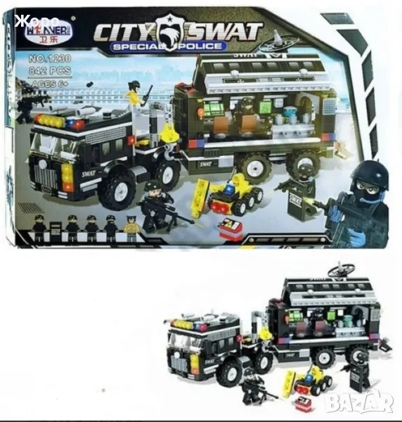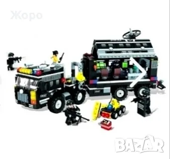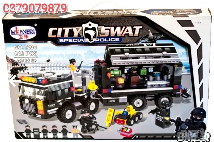 Конструктор Police Station SWAT от серия city police съдържа 842 части на специален отряд за борба с тероризма. Играта включва брониран полицейски камион , мини фигурки на спец службата, снайперист,щурмовак, мини фигурки на терористи и заложници, допълнително специални разузнавателни средства.
