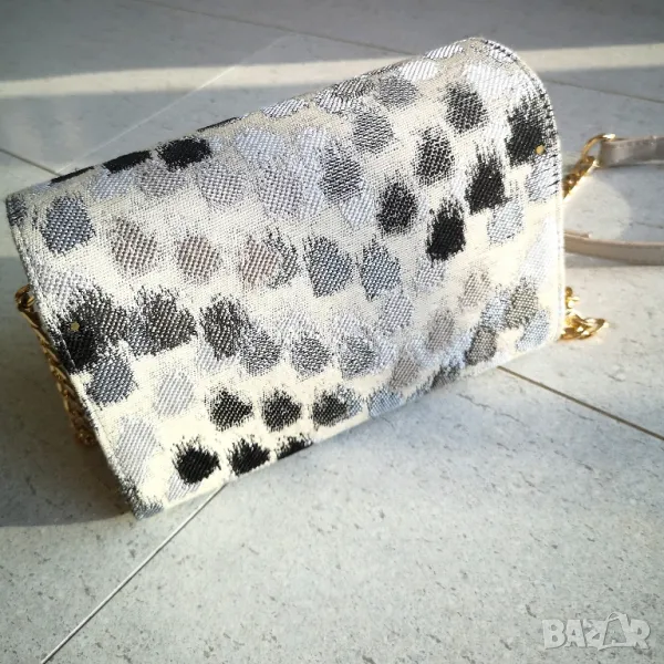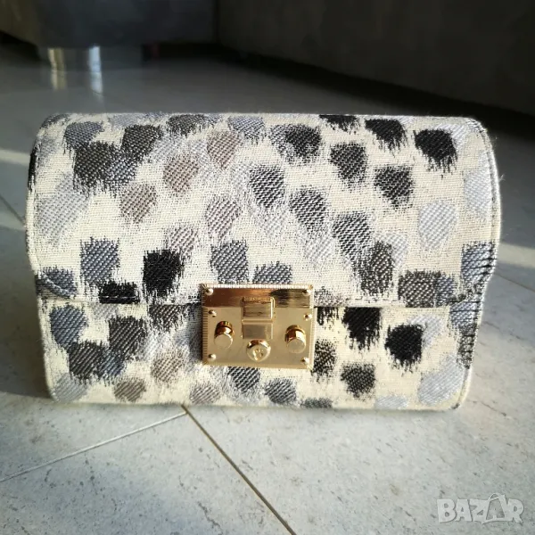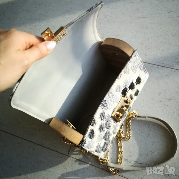 Дамска чанта от еко кожа, плат и дървен материал със златиста закопчалка и верижка. Побира доста. Носена броени пъти. Много интересен модел. Размери 21х14х10см.