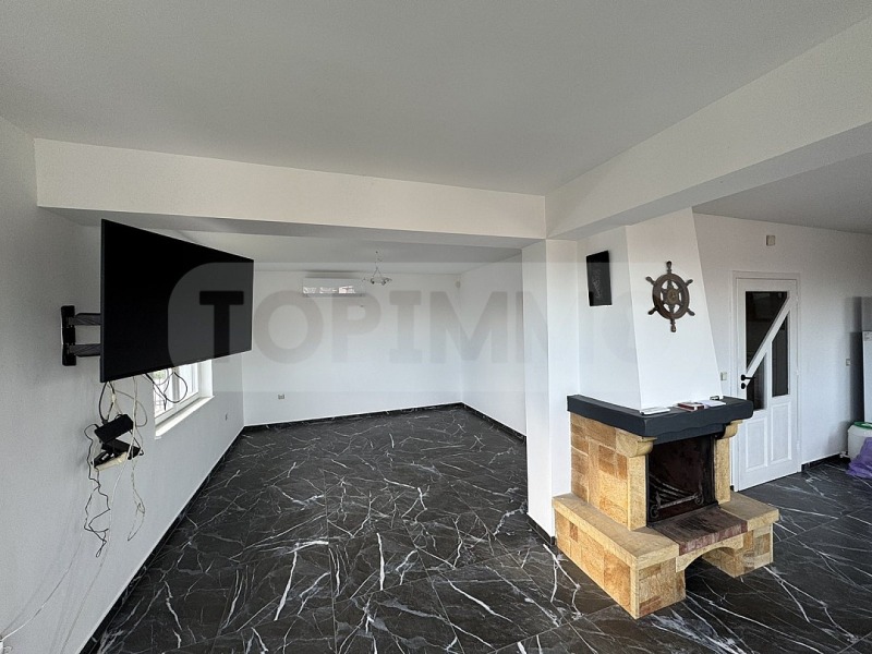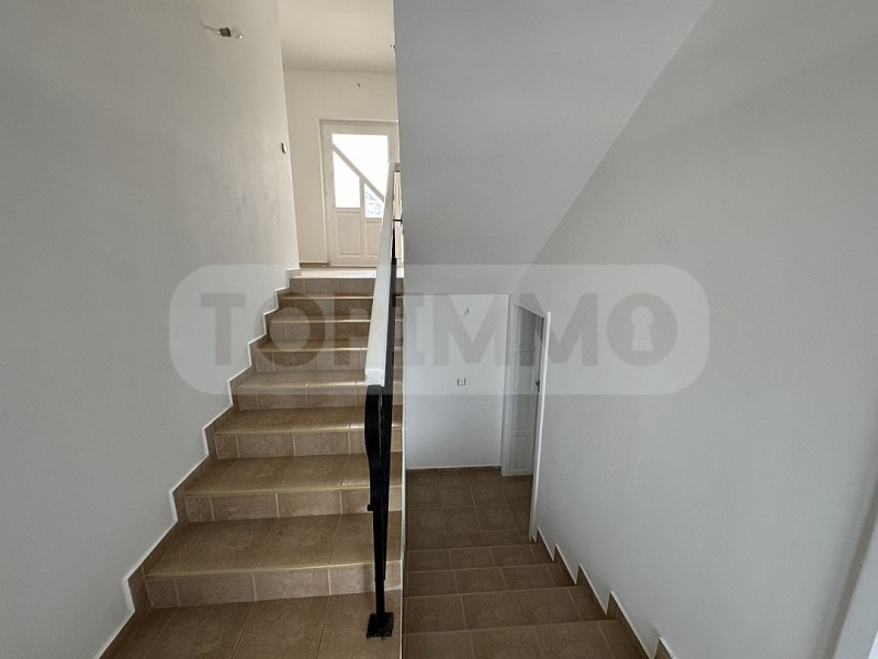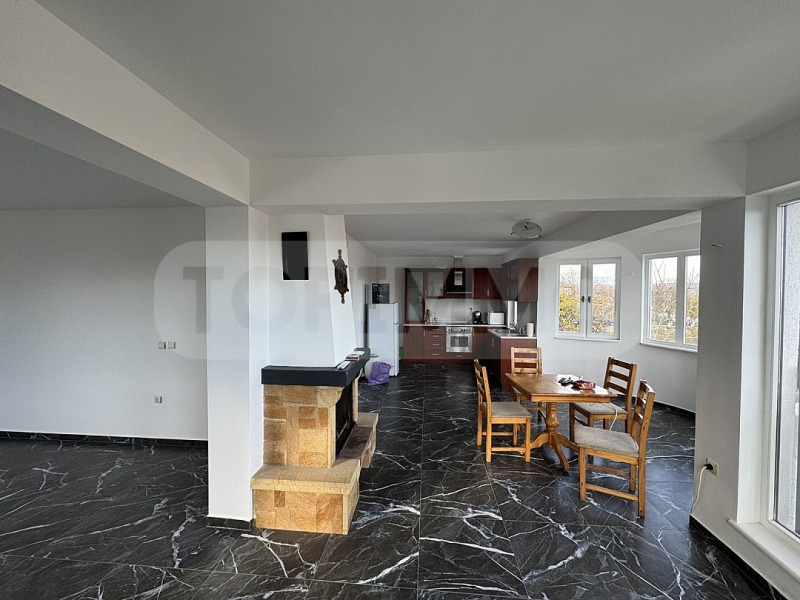 Втори етаж: гараж с топла връзка, голяма дневна с трапезария, кухненска част и камина, баня с тоалетна.