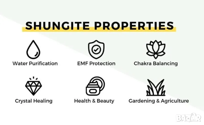 Доказано е, че шунгита неутрализира болестотворните зони и има благотворно въздействие върху здравето на хората. Шунгит може да се използва и за активиране на вода, която придобива мощни лечебни и козметични свойства.