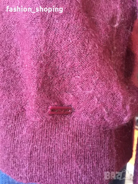 Пуловер на популярния бранд Marco Polo в най-актуалния за зимния сезон цвят бордо (марсала). Пуловерът има в състава си мохер и вълна, на които се дължи топлината и мекотата му при докосване. Леко прозира, което го прави подходящ за носене със секси боди/бюстие в подобен нюанс за загатваща, магентична визия. С обло деколте. Стои свободно. Много наситен и открояващ се цвят.
