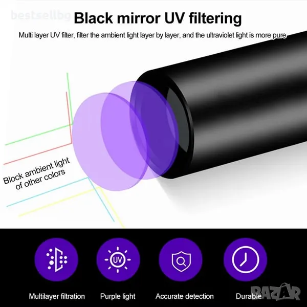 - Прецизна и чиста UV светлина: Благодарение на иновативния черен филтър, фенерът излъчва 99% чиста 365nm UV светлина, което позволява да се откриват дори и най-малките флуоресцентни следи.