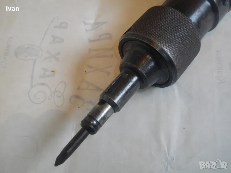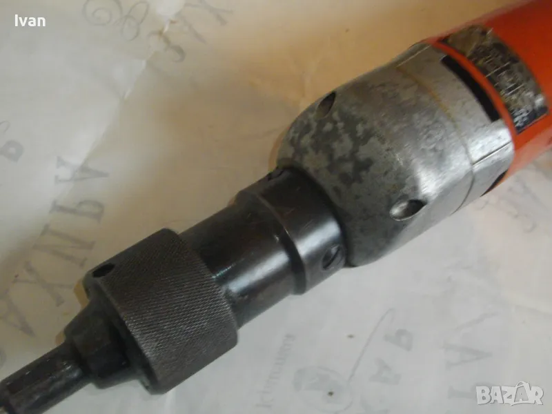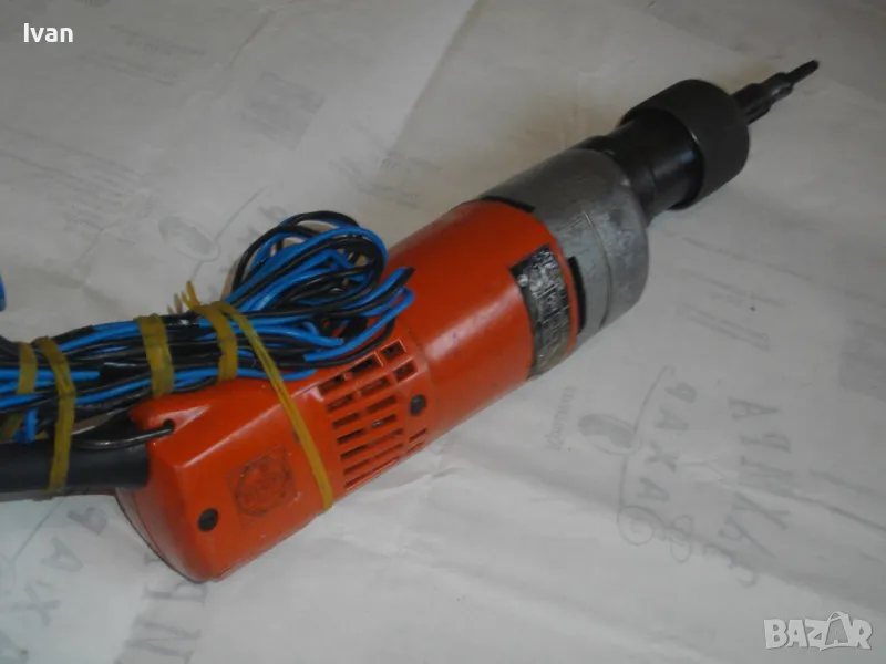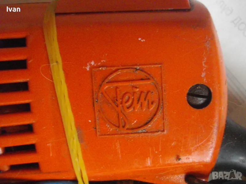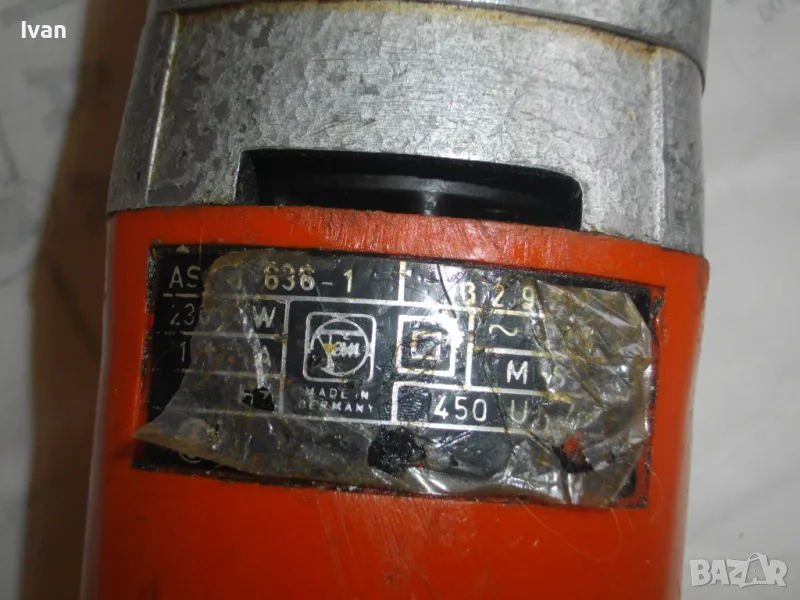 Електрически прав шлайф Фейн. Немски оригинален. Професионална машина. Мощност 230 вата, скорост 450 об/мин. 230 волта, 50 херца. Марка и модел Fein 636-1 Made in Germany. За накрайници отпред размер М6. Машина от старото високкачествено професионално немско производство. В отлично работно състояние. Стомана и твърда пластмаса корпус, със страничен пусков ключ с приплъзване. Реверс смяна посока въртене.Глава патронник отпред от инструментална закалена стомана. Поставен оригинален накрайник в главата - кръстат бит дълъг за завинтване. Заранващия кабел е сменен с дълъг двужилен около 5 м. Дължина на машината - 36 см, с накрайника отпред - 40 см. Тегло - 2,8 кг.