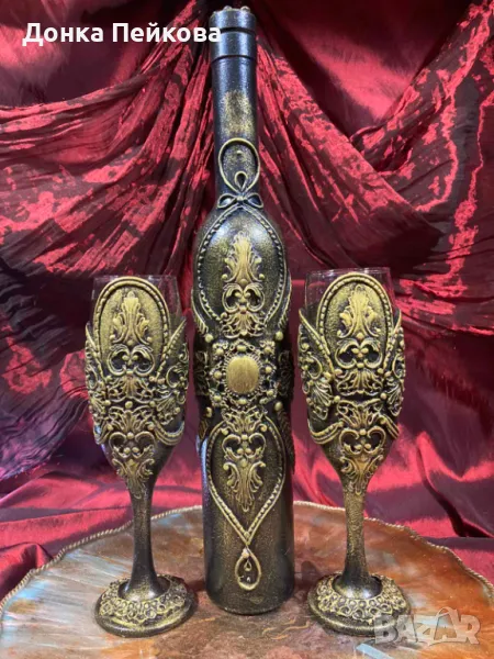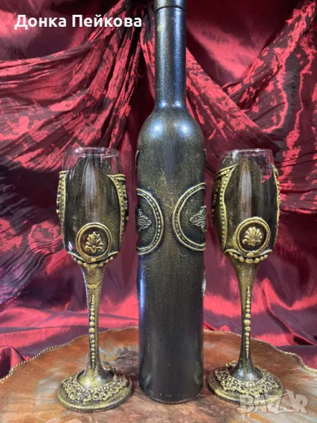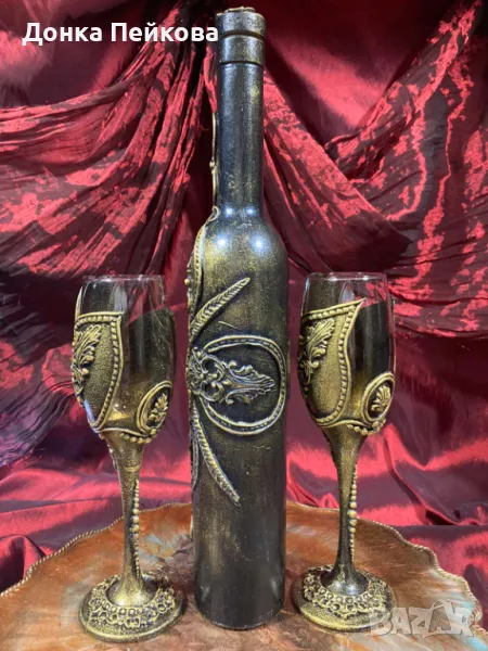 с имитация на старо злато и сребро - един впечатляващ подарък за годишнина, за Рожден Ден, за абитуриентска, за сватба, за годишнина, подарък с който гарантирано ще впечатлите всички! Комплекта е единствен и няма да има друг такъв, което го прави уникален. Съдържа бутилка за любимо питие, която не съдържа алкохол + 2 чаши. За изработката са използвани безвредни и водустойчиви материали. Може да се мие с мека гъбичка и без накисване. Да не се мие в съдомиялна машина и да не се мие с гореща вода.