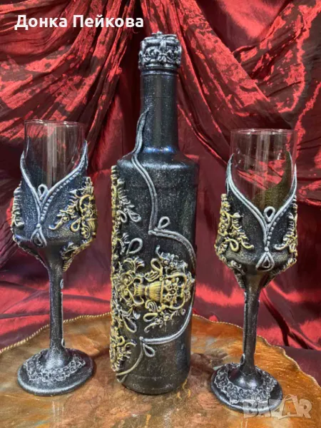 с имитация на старо злато и сребро - един впечатляващ подарък за годишнина, за Рожден Ден, за абитуриентска, за сватба, за годишнина, подарък с който гарантирано ще впечатлите всички! Комплекта е единствен и няма да има друг такъв, което го прави уникален. Съдържа бутилка за любимо питие, която не съдържа алкохол + 2 чаши. За изработката са използвани безвредни и водустойчиви материали. Може да се мие с мека гъбичка и без накисване. Да не се мие в съдомиялна машина и да не се мие с гореща вода.