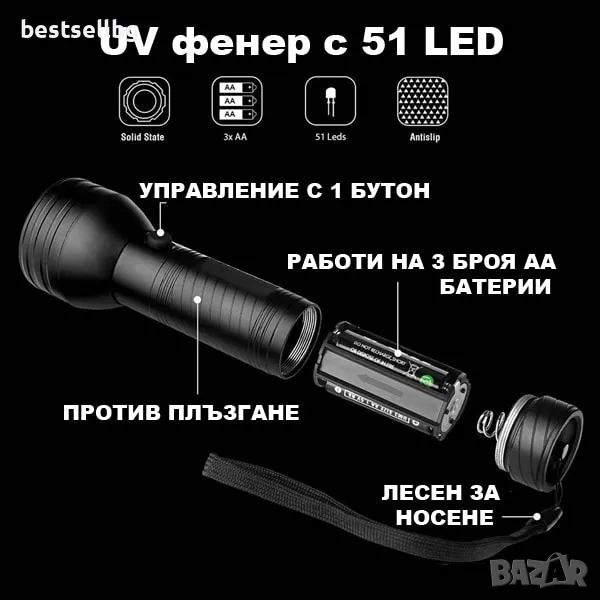 - Професионална мощност: С 51 UV LED диода, този фенер осигурява интензивна ултравиолетова светлина, която ефективно осветява дори и най-малките замърсявания.