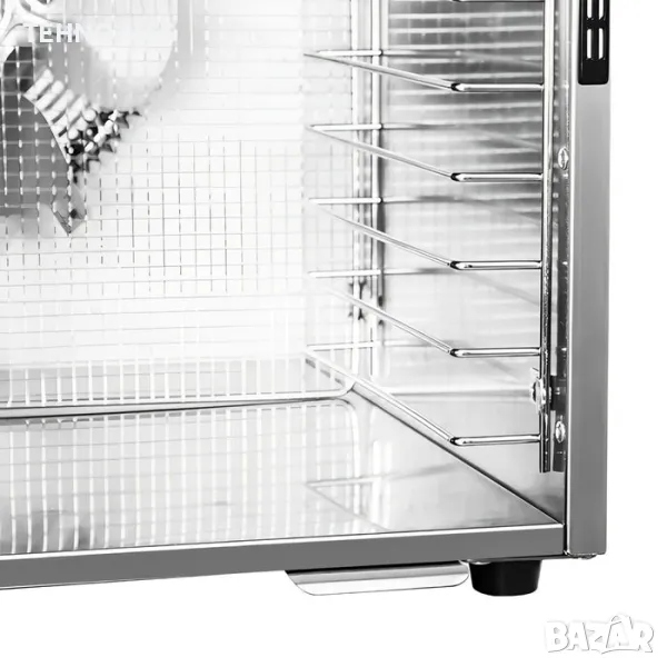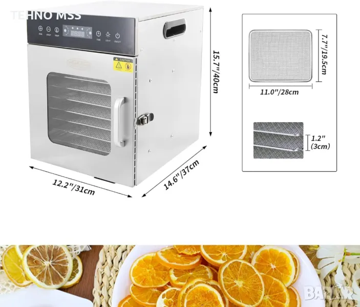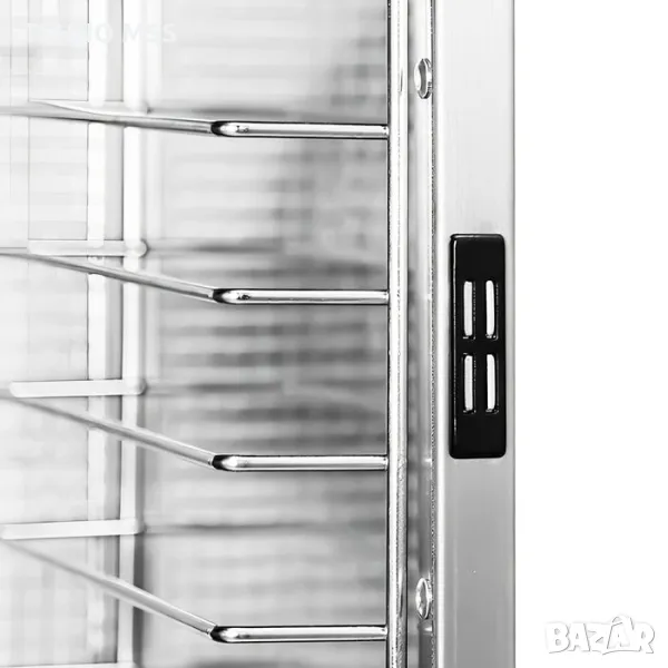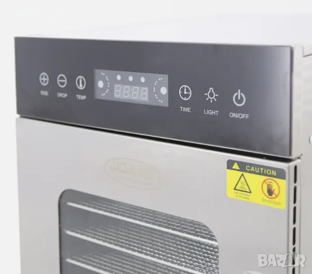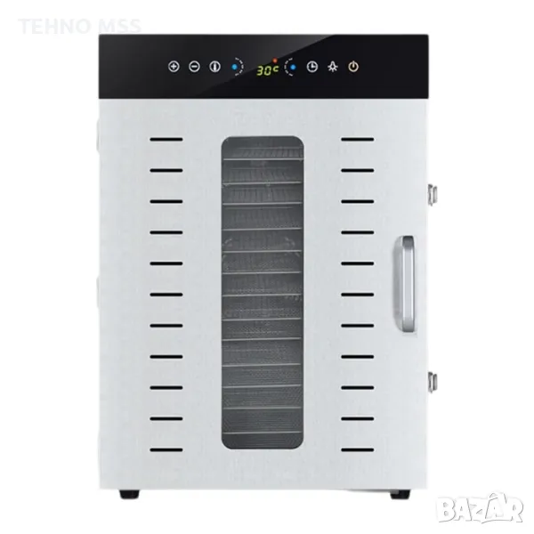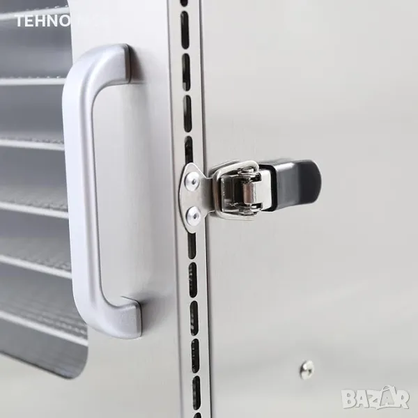 Корпусът е от неръждаема стомана, за да е издръжлив и елегантен, а прозрачната стъклена врата ви позволява да видите с един поглед как се справят продуктите ви, без да се налага да отваряте дехидратора.