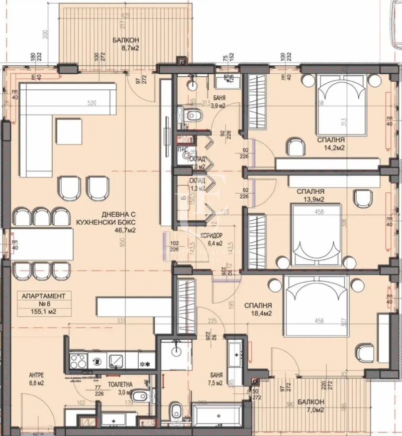 Апартаментът има следното разпределение: входно атре, просторна дневна с кухненски бокс, три спални, две бани с тоалетна, тоалетна за гости, склад, два балкона. Цената е без включен ДДС. Ref. ID:24829