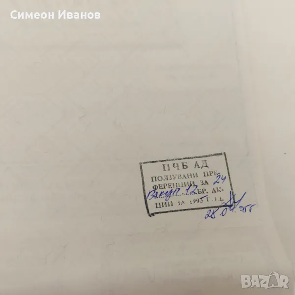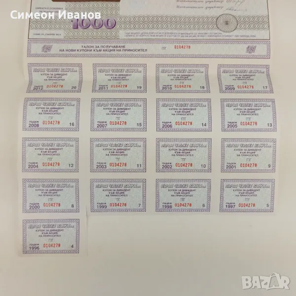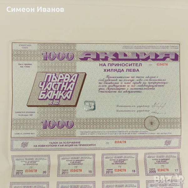 Акция 1000 лв Първа Частна Банка Емисия 1994 № 4590 → Обява 48145673