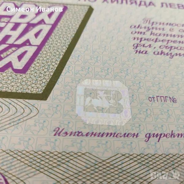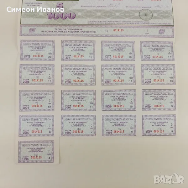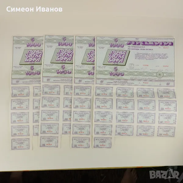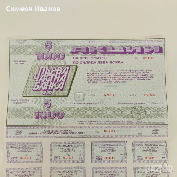 Акция 5 х 1000 лв Първа Частна Банка Емисия 1994 № 4589 → Обява 48145681