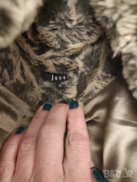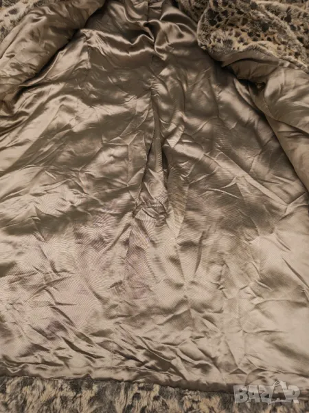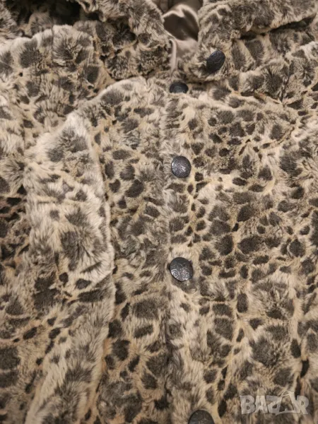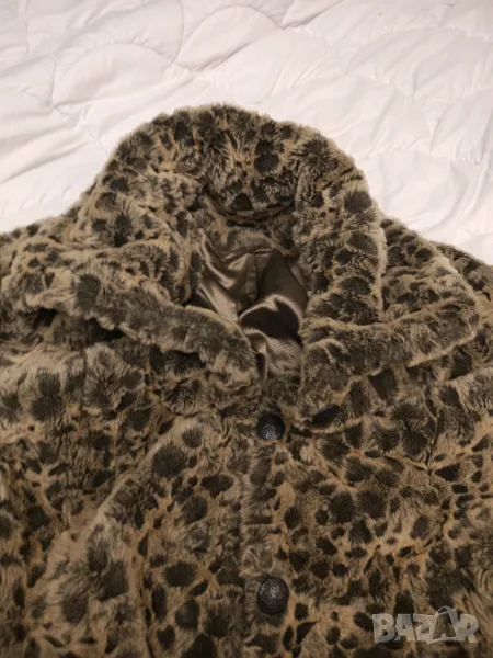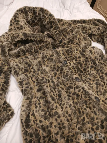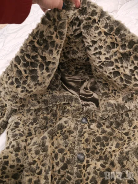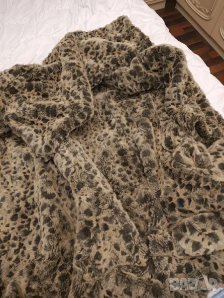 Страхотно палто имитация на снежен леопард.Плътно качествено и топло Яка като голям шал.Размер етикет 40.Дължина 100 см Мишници 50 см Рамена 42 см Ръкав 60 см.Цвета се мени според светлината.Носила съм го точно 2 пъти но за жалост ми е тясно.Пергектно състояние .Крайна цена без бартери.поради зачестили злоупотреби не изпращам със проба