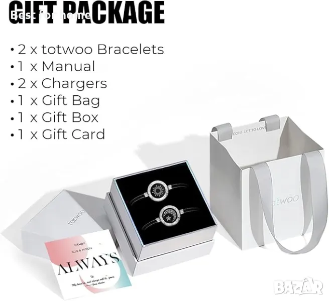 Totwoo предоставя невероятна възможност да изразите любовта си по всяко време и на всяко място. След като свържете Totwoo с вашето приложение Totwoo чрез Bluetooth, просто докоснете гривната си и гривната на партньора ви ще светне и ще вибрира, показвайки, че мислите за него, независимо че е в другия край на стаята или на другия край на света.