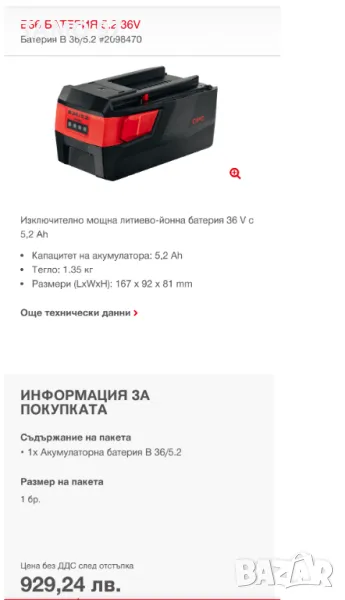 Продавам мощна акумулаторна батерия на Хилти 36V 5.2Ah с индикатор за машини и инстрименти, които работят с този тип батерия. Батерията е използвана много малко, държи заряд и работи перфектно, оригинално полско производство от 10.2023г. внос от Франция. Пращаме с опция преглед и тест с куриерска фирма еконт може и лично предаване за гр. Шумен.