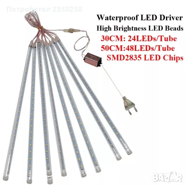 падащ сняг и възможност за удължаване до 4 броя от същия вид. Подходяща за вътрешна и външна украса (степен на защита IP44). Продуктът е изработен с високо качество, като ефектните светлини се получават от светодиоди, което гарантира дългия му живот. Ако е необходима по-голяма дължина е необходимо да се подмени захранващия модул 5V DC с такъв отговарящ на използваната дължина.