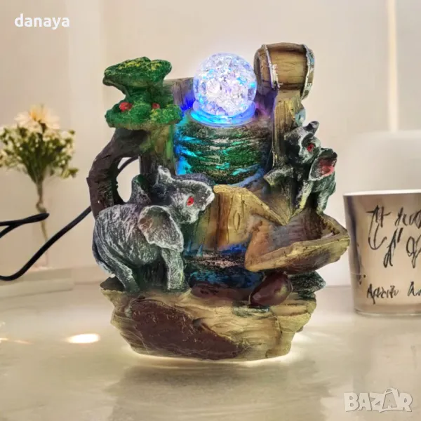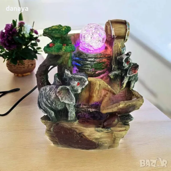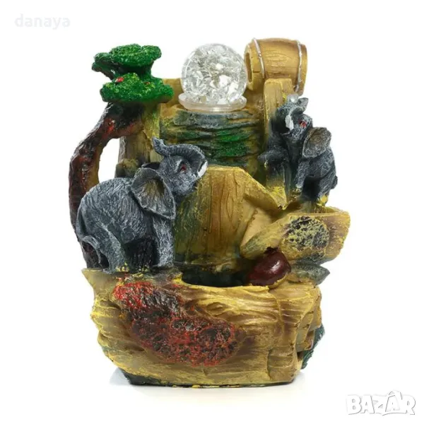 Добавете хармония и уют в дома си с този декоративен фонтан. Дизайнът включва две очарователни слончета и водопад, символизиращи просперитет и късмет. Вградена кристална топка с LED светлини създава магически ефект, осветявайки помещението с мека и релаксираща светлина.