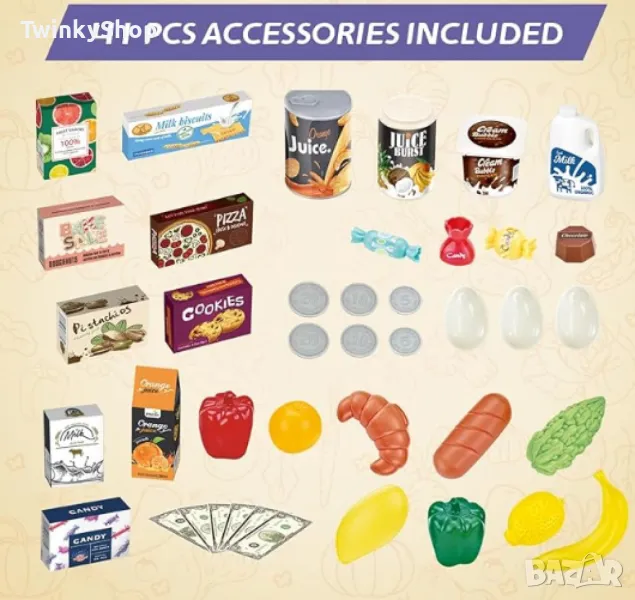 Комплект количка за пазаруване в супермаркет със светлини и музика е забавен и интерактивен аксесоар за деца. Количката е снабдена с вградени светлинни ефекти и звукови функции, които правят играта още по-вълнуваща. Тя работи с две батерии 1.5V AA, които не са включени в комплекта. Размерите на количката са 49.78 x 43.43 x 29.97 см, като тя тежи 1.09 кг, което я прави лесна за маневриране и подходяща за деца, които обичат да играят в роля и имитират пазаруване.